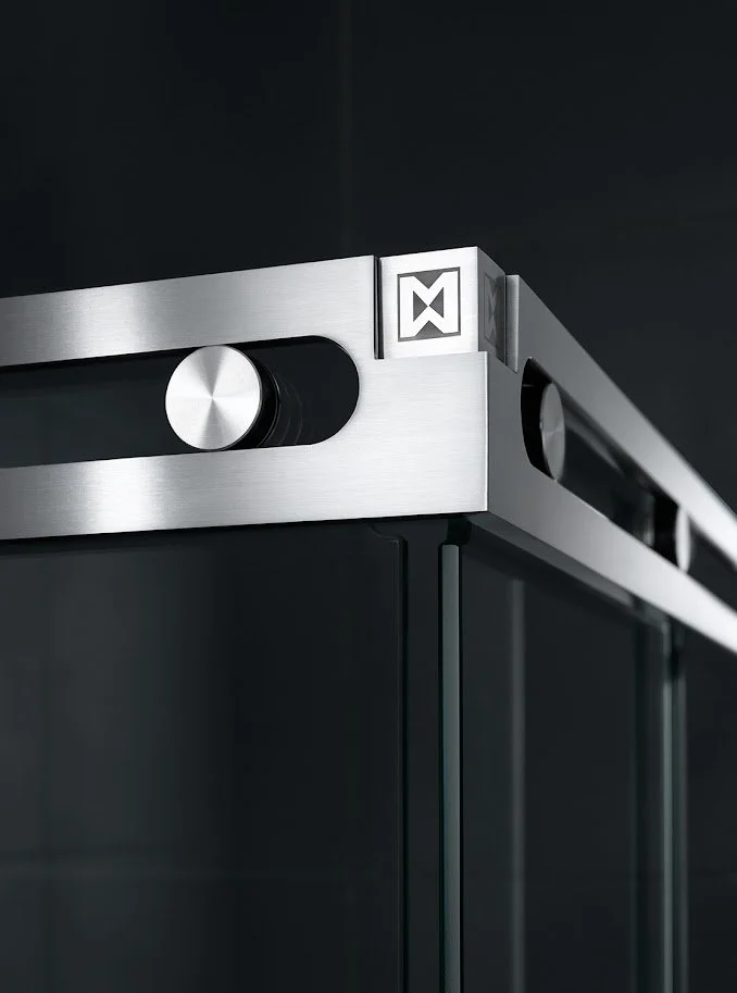 This extraordinary design focuses on the negative spaces the dual purpose slotted track serves as a fixed glass support and functions as the rail for the wheels of the active panel.